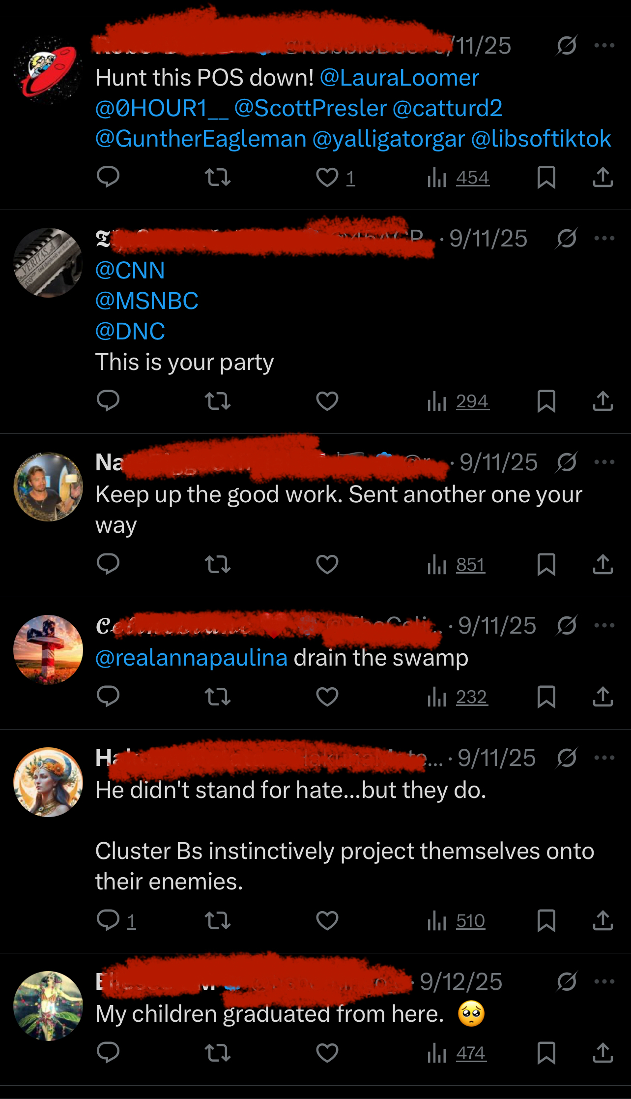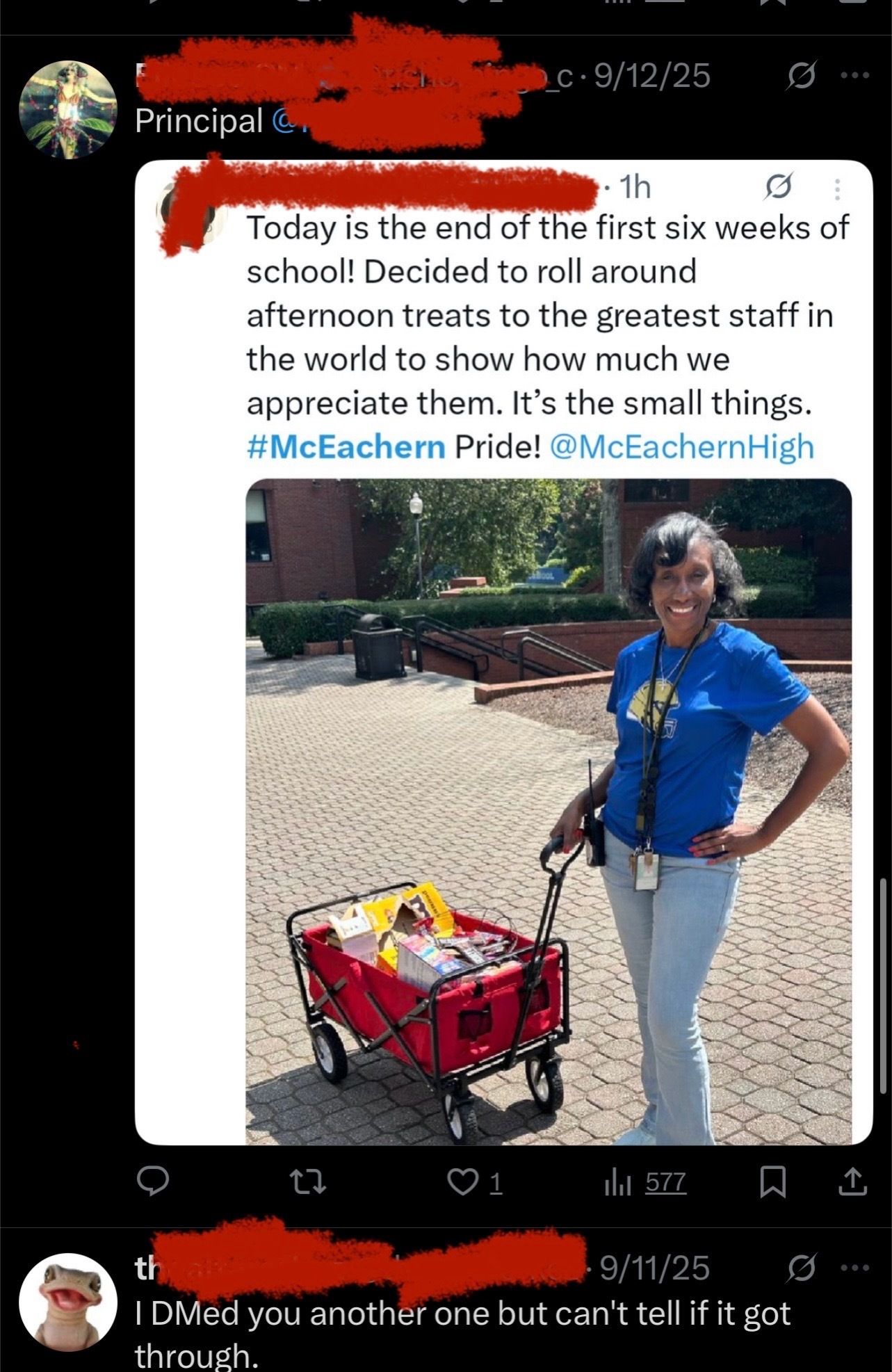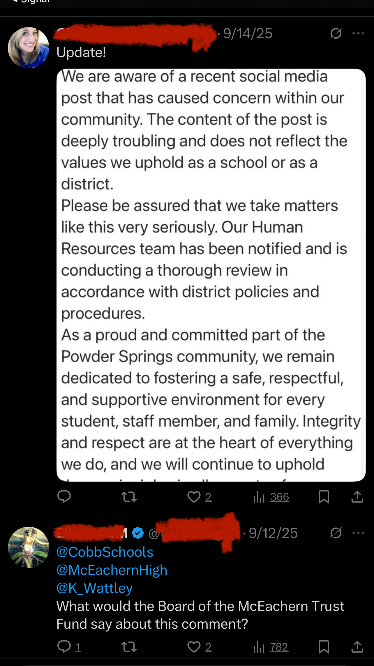Replies of, “I let them have it,” and “ Hunt this POS down” appeared alongside photos of McEachern’s principal. A day later, someone shared their response from Cobb County Schools that the teacher was under investigation. By Saturday it was circulating on Facebook and within seven days Cobb Superintendent Chris Ragsdale proudly announced several teachers had been removed for “celebrating” Charlie Kirk’s death.