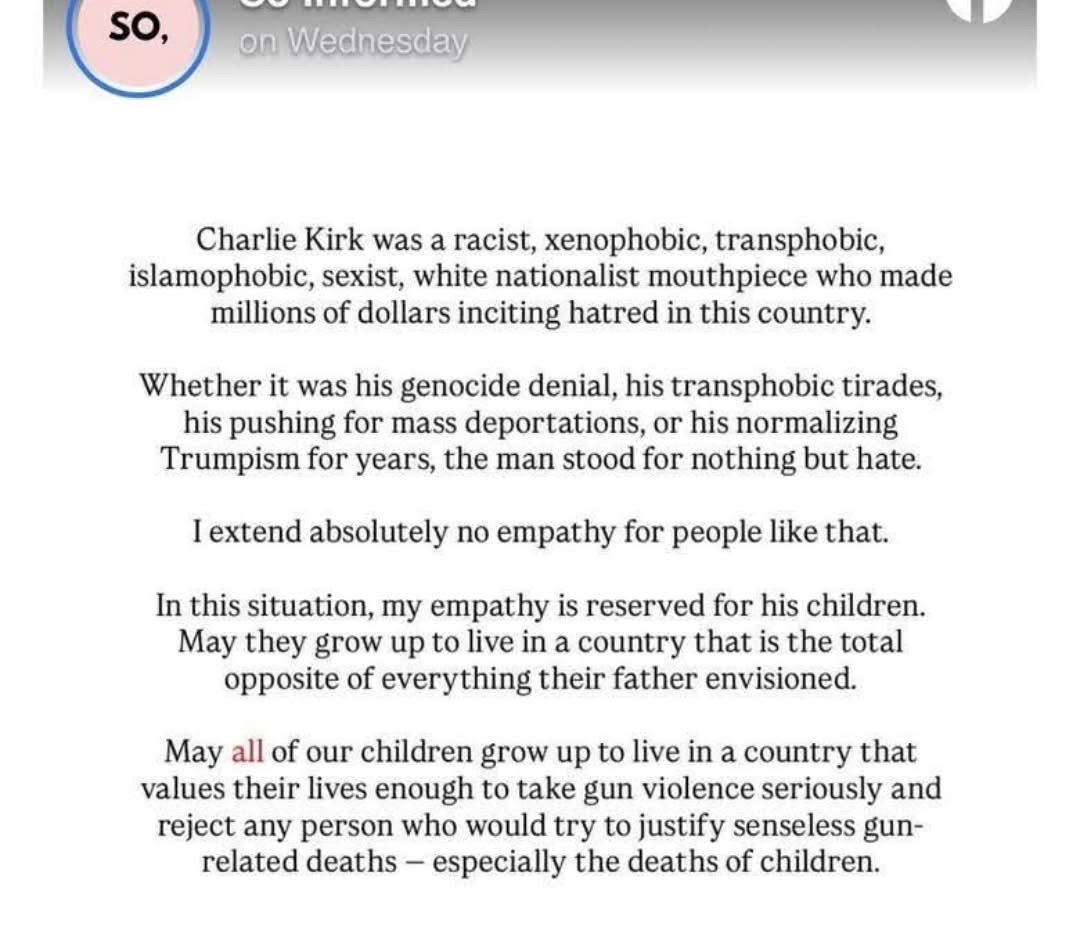 “Charlie Kirk was a racist, xenophobic, transphobic, Islamophobic, sexist, white nationalist mouthpiece who made millions of dollars inciting hatred in this country.