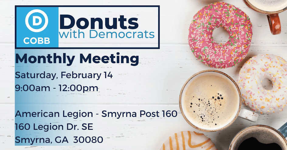 Donuts with Dems! February 14, 2026 Location: American Legion - Smyrna Post 160 160 Legion Dr SE Smyrna, GA 30080 More information to come! RSVP
